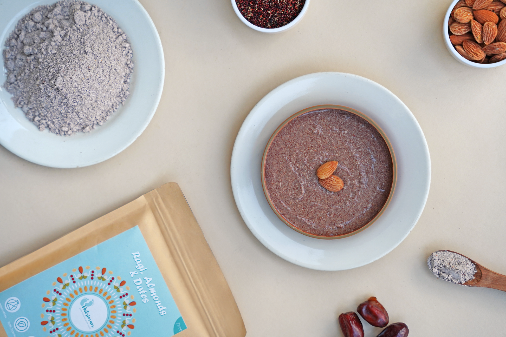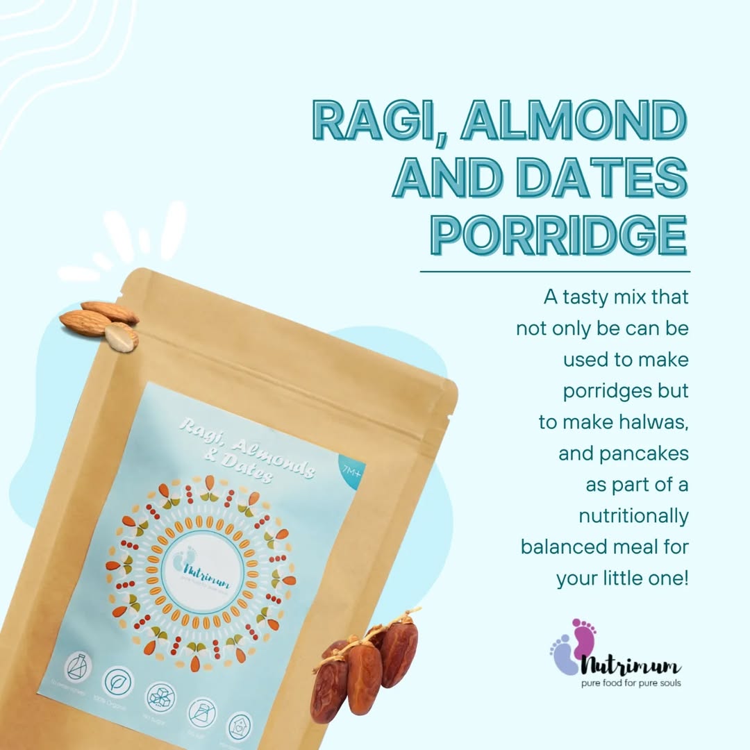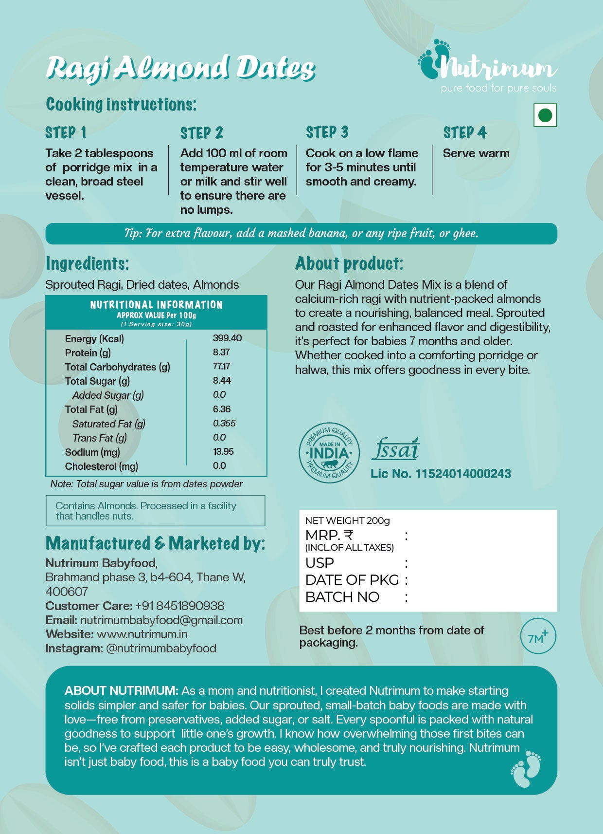 Ingredients: Crafted with a harmonious combination of Ragi, Almonds, and Dried Dates, our Ragi Dates Almond blend offers a nutrient-rich medley. Please note that this product contains Almonds, a common allergen. Each ingredient is carefully selected to provide a delicious and nutritious meal for your little one.
