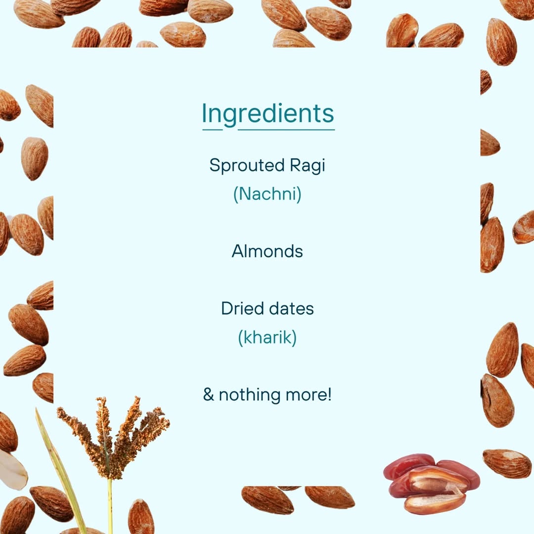 Preservative Free, Sugar-Free, Salt-Free: Our Ragi Dates Almond blend is free from harmful preservatives, added sugars, and salts. We believe in offering your baby pure, natural goodness without compromising on taste.